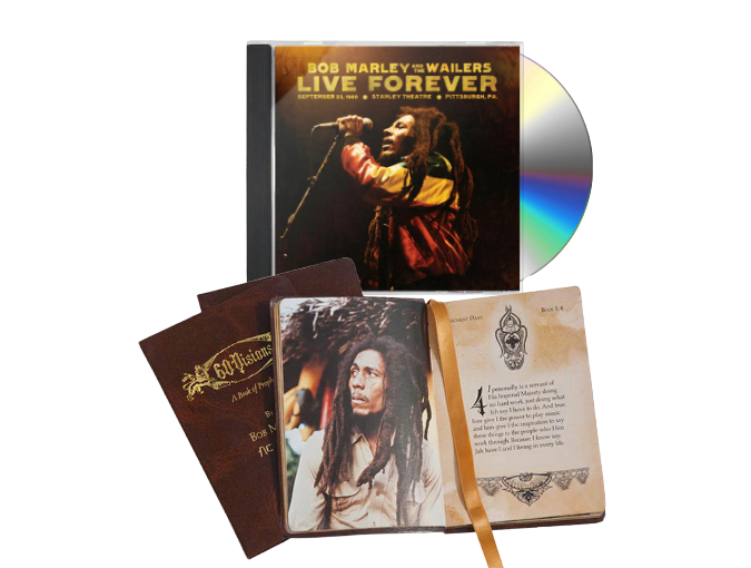 Special collector's set includes one Bob Marley & The Wailers Live Forever double CD, one copy of the book, Bob Marley 60 Visions, and one Bob Marley t-shirt (please select your size).